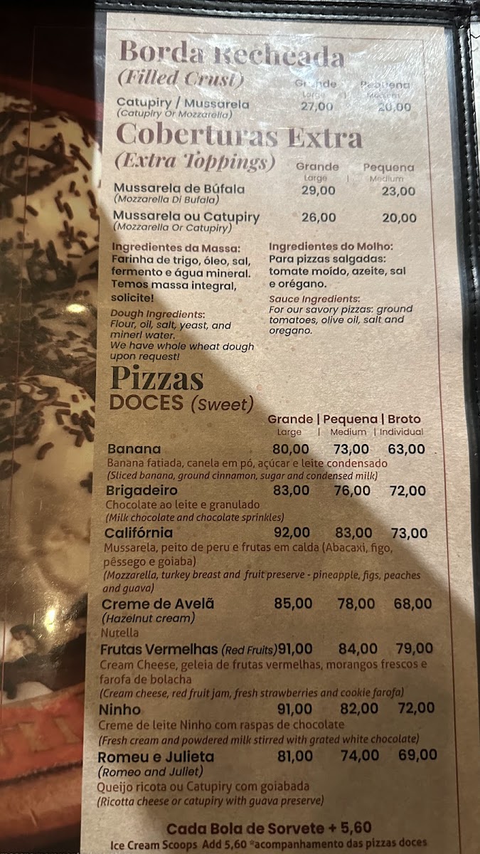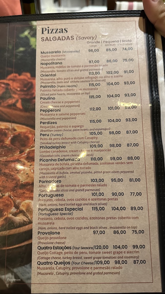 In conclusion, the menu at Pizzaria Paulino Pinheiros offers a well-rounded selection that balances traditional Brazilian flavors with classic pizzeria favorites, making it a satisfying choice for both casual diners and pizza enthusiasts. The drink options, including Sex on the Beach and Mojito, complement the food menu nicely, adding a refreshing touch that pairs well with the rich flavors of the pizzas. Among the standout dishes, the Portuguesa Borda Torrada impresses with its generous toppings and the appealing crunch of its toasted crust, while the Moda da Casa reflects the restaurant’s signature style, combining quality ingredients and balanced flavors that represent the house specialty well. Overall, the menu demonstrates consistency, variety, and good value, leaving a positive impression and making the restaurant a reliable destination for those looking to enjoy hearty pizzas and classic drinks in a relaxed setting.